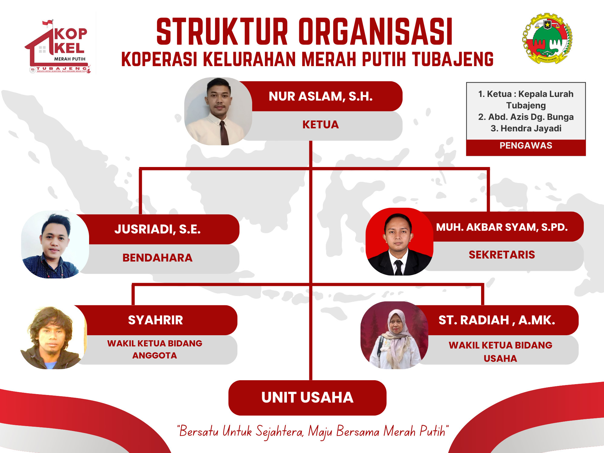 Koperasi merah puti kelurahan tubajeng yang di nakodai oleh Nursalam S.H.serta di dampingi oleh sekertaris Muh.Akbar Syam,S.pd. dan Bendahara.Jusriadi Shein S.E. ini adalah generasi yang tangguh dan berani menggebrak untuk memajukan koperasi merah putih di wilayah kelurahan.