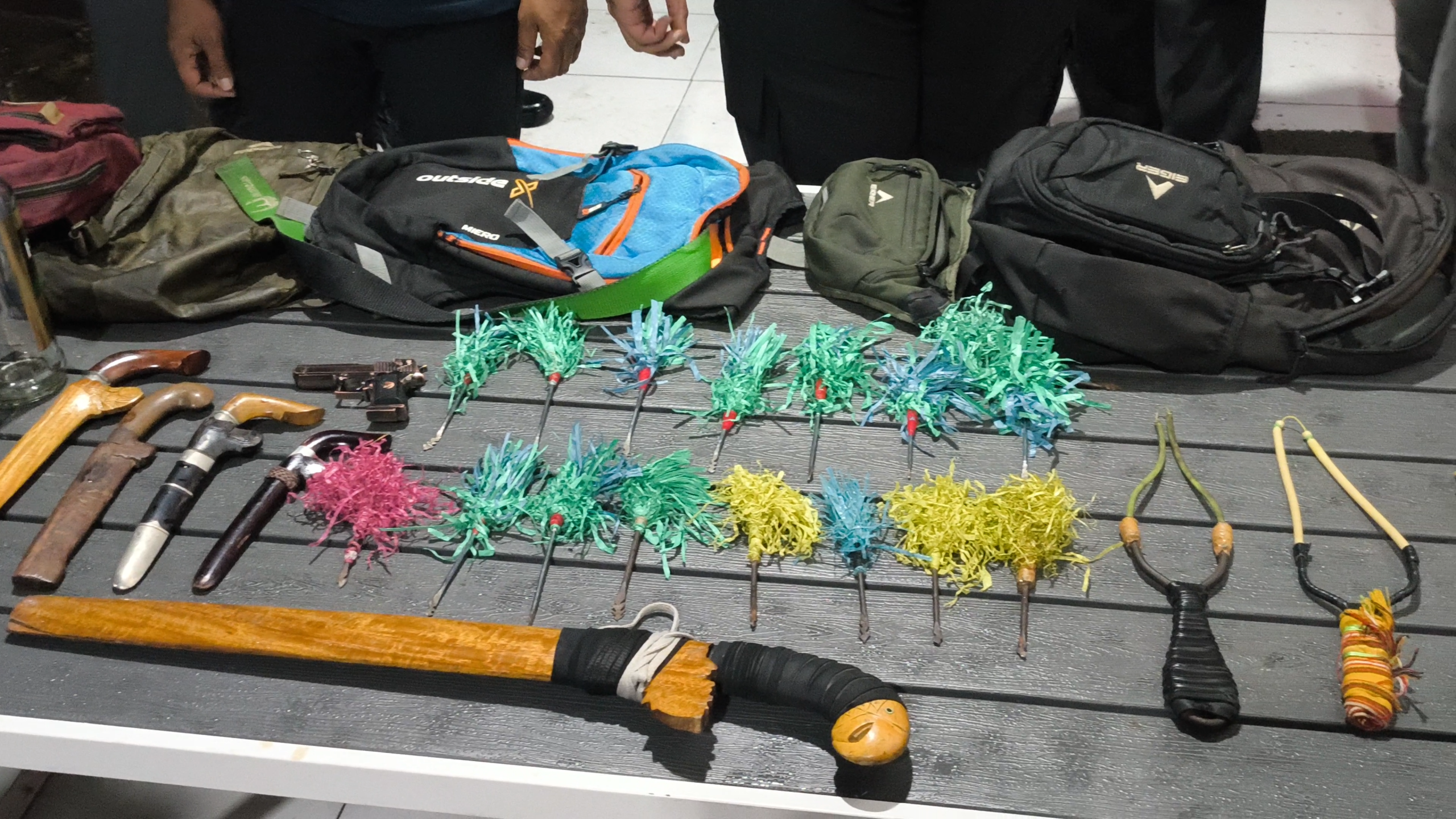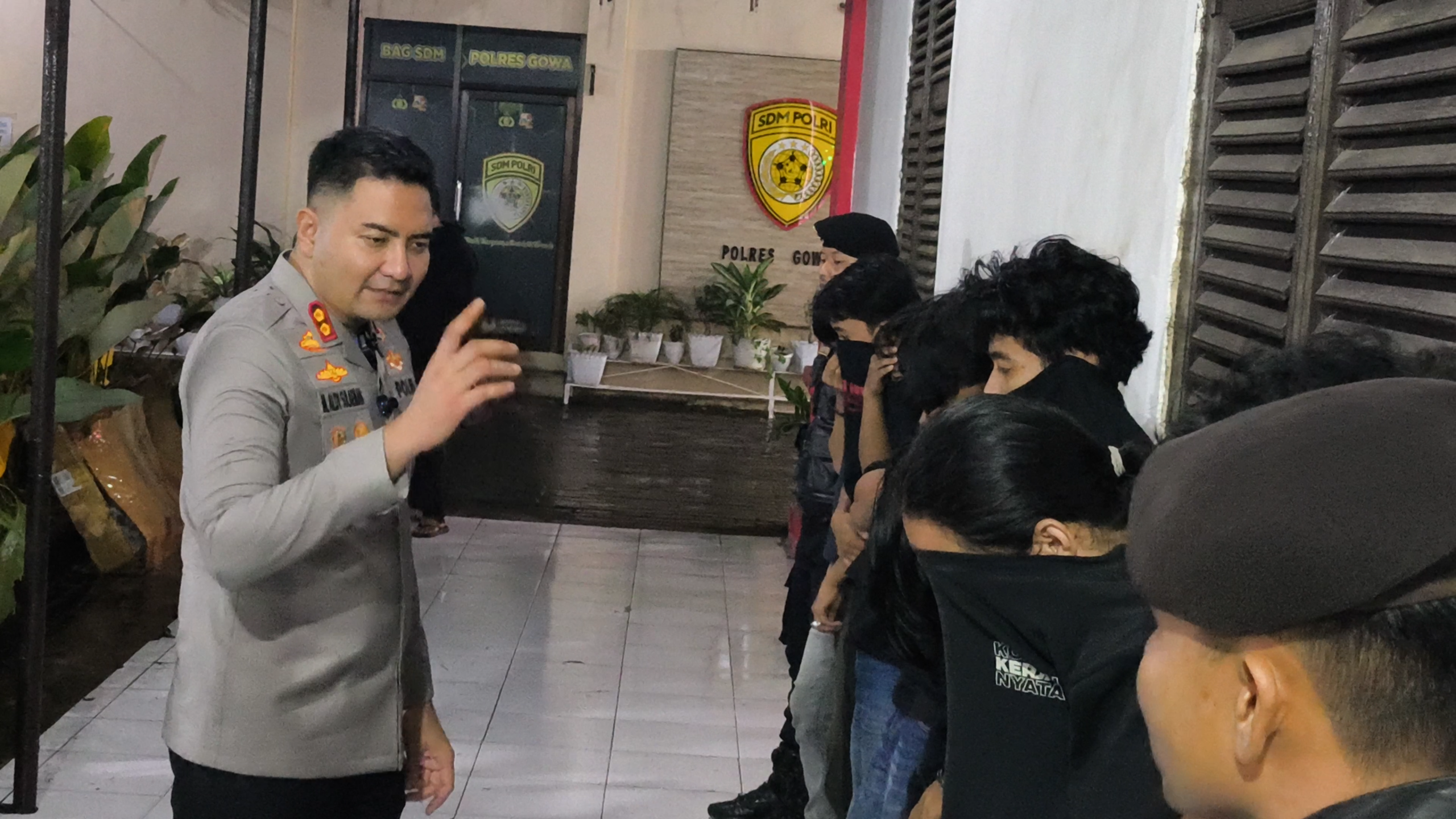 “Dapat kami sampaikan, seperti yang saudara lihat, ada beberapa anak muda yang berhasil kami amankan. Juga ada beberapa ketapel, beberapa parang, badik, serta minuman keras,” ungkap Kapolres Gowa.