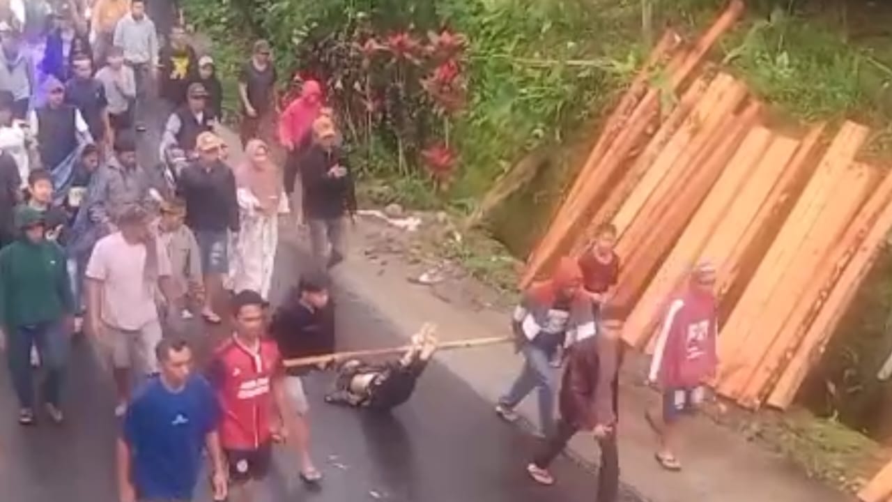Dalam video yang beredar, warga tampak mengikat tangan dan kaki terduga pelaku, lalu menyeretnya menggunakan sepeda motor sebelum diarak keliling kampung.