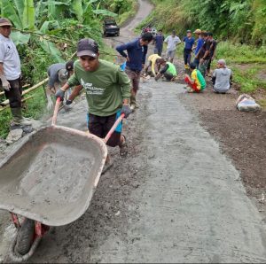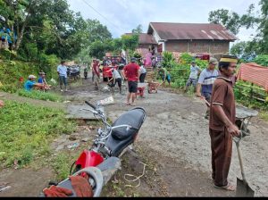 Sejak pagi hari, warga tampak berkumpul membawa berbagai peralatan kerja seperti cangkul, sekop, dan gerobak dorong. Mereka bersama-sama menyiapkan material berupa pasir, batu, dan semen untuk melakukan pengecoran pada bagian jalan yang rusak. Dengan penuh semangat kebersamaan, warga bahu-membahu mencampur material, mengangkut adukan semen, hingga meratakan coran pada badan jalan.