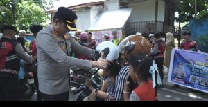 Kapolres Gowa Peduli Dengan Keselamatan Pengendara Roda Dua.Warga Gembira Mendapat Helem Gartis.